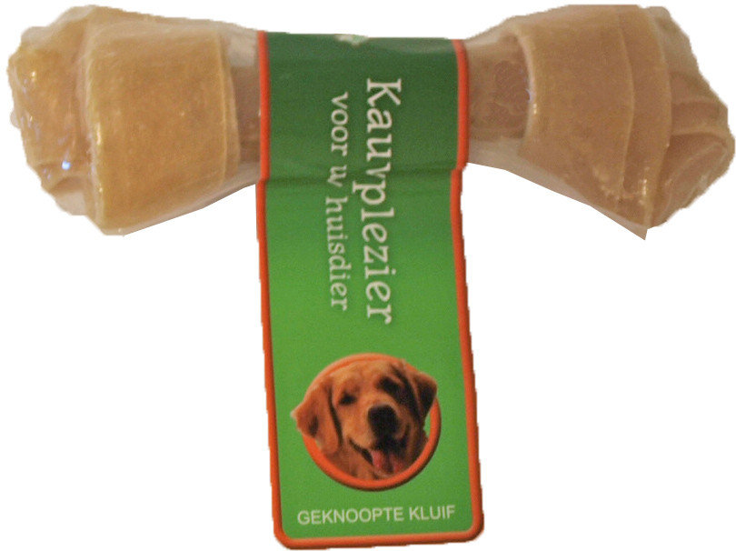 Geknoopte kauwkluif van buffelhuid waarbij de twee knopen aan de uiteindes van het bot bijdragen aan een goed gebit en tandvlees.