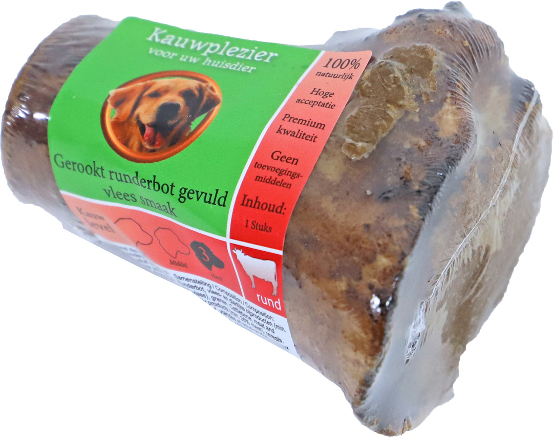 De natuurlijke snack gerookte rundermergpijp met vleesvulling is een heerlijke verwennerij voor elke hond.