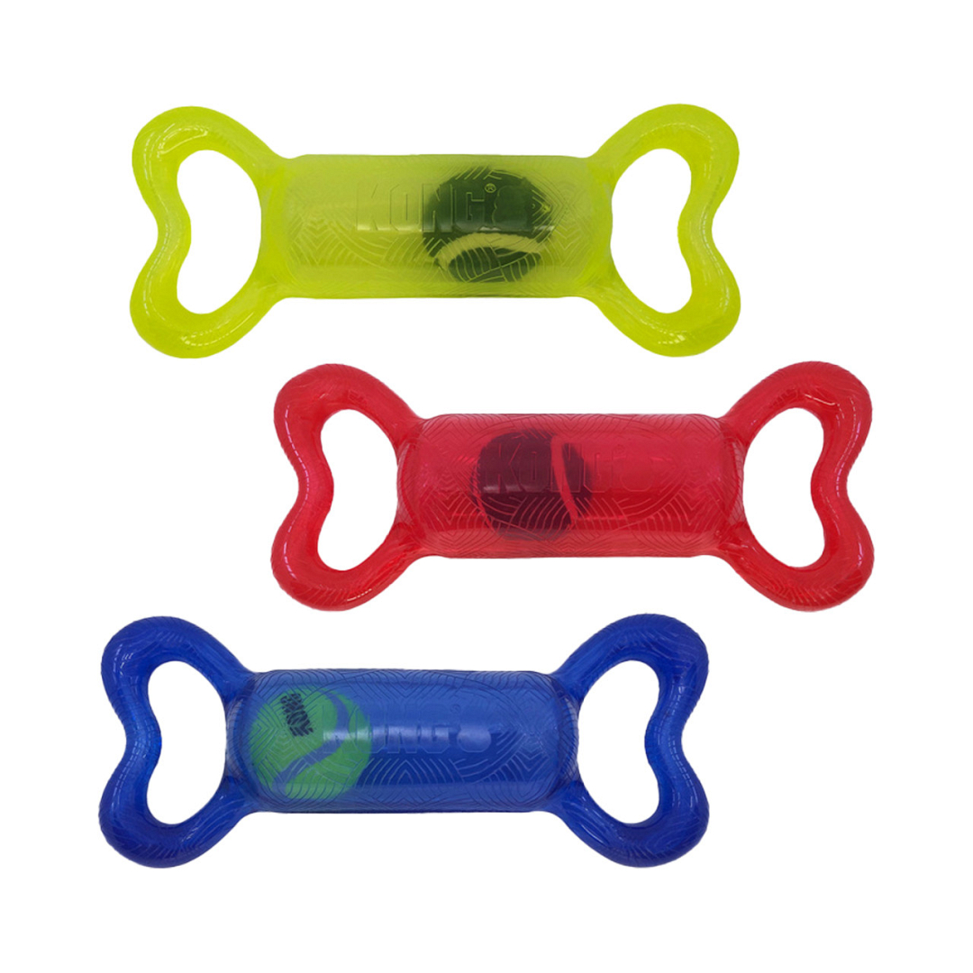 Ontdek de Kong Jumbler Tug, het vrolijke trek- en apporteerspeeltje. De geïntegreerde piep maakt spelen met deze Tug nog leuker! De gekleurde tennisbal welke in dit speeltje verwerkt zit, wekt ook de interesse van jouw trouwe viervoeter, omdat deze door het speeltje heen wordt geschud tijdens het spelen. De handvatten aan beide zijden van het speeltje zijn ideaal voor extra grip en maken het mogelijk dit speeltje ver weg te gooien voor extra apporteerplezier.