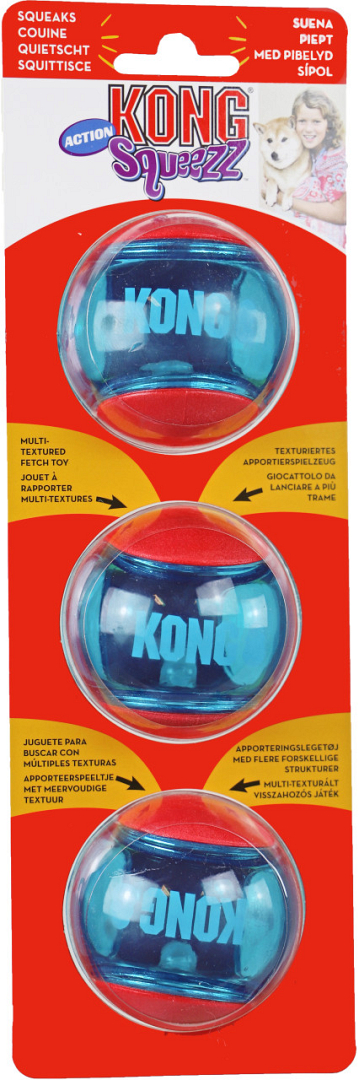 De Kong Squeez Action bal met levendige kleuren en verschillende texturen is het perfecte speeltje voor plezier met stuiteren, gooien en rollen. Piepgeluiden zorgen voor extra enthousiasme.