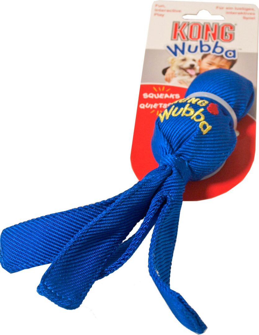 De Kong Wubba is een grappig gooi- en trekspeeltje gemaakt van onverslijtbare, verstevigde nylon stof met daarin een tennis- en een piepbal. Door de lange staarten is het gemakkelijk op te pakken en te gooien. Honden zijn er dol op om de Wubba te laten piepen en de slingerende staarten heen en weer te schudden.