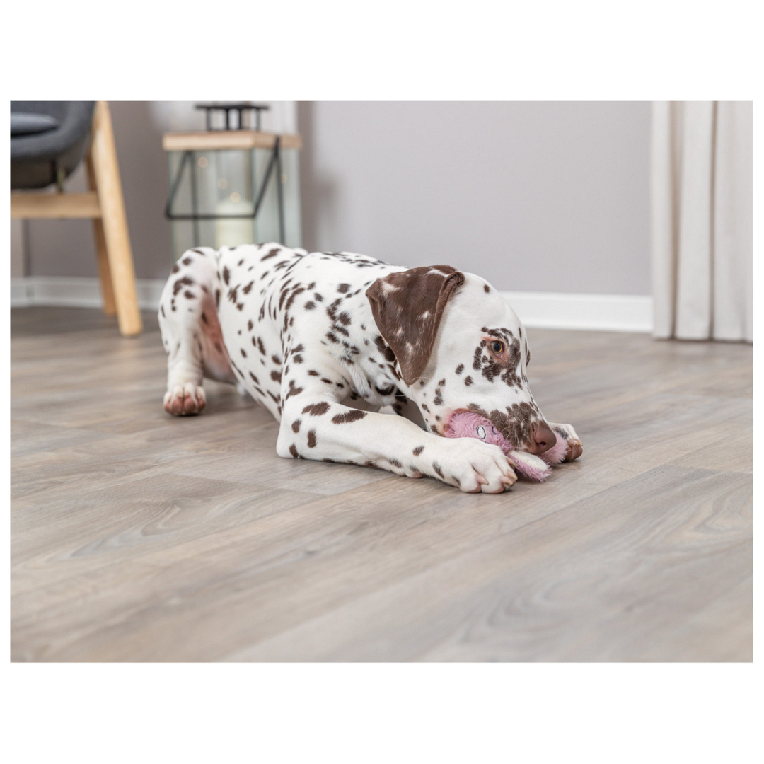 De TRIXIE Junior Haas Ring puppyknuffel is gemaakt van polyester pluche met een TPR bijtring.