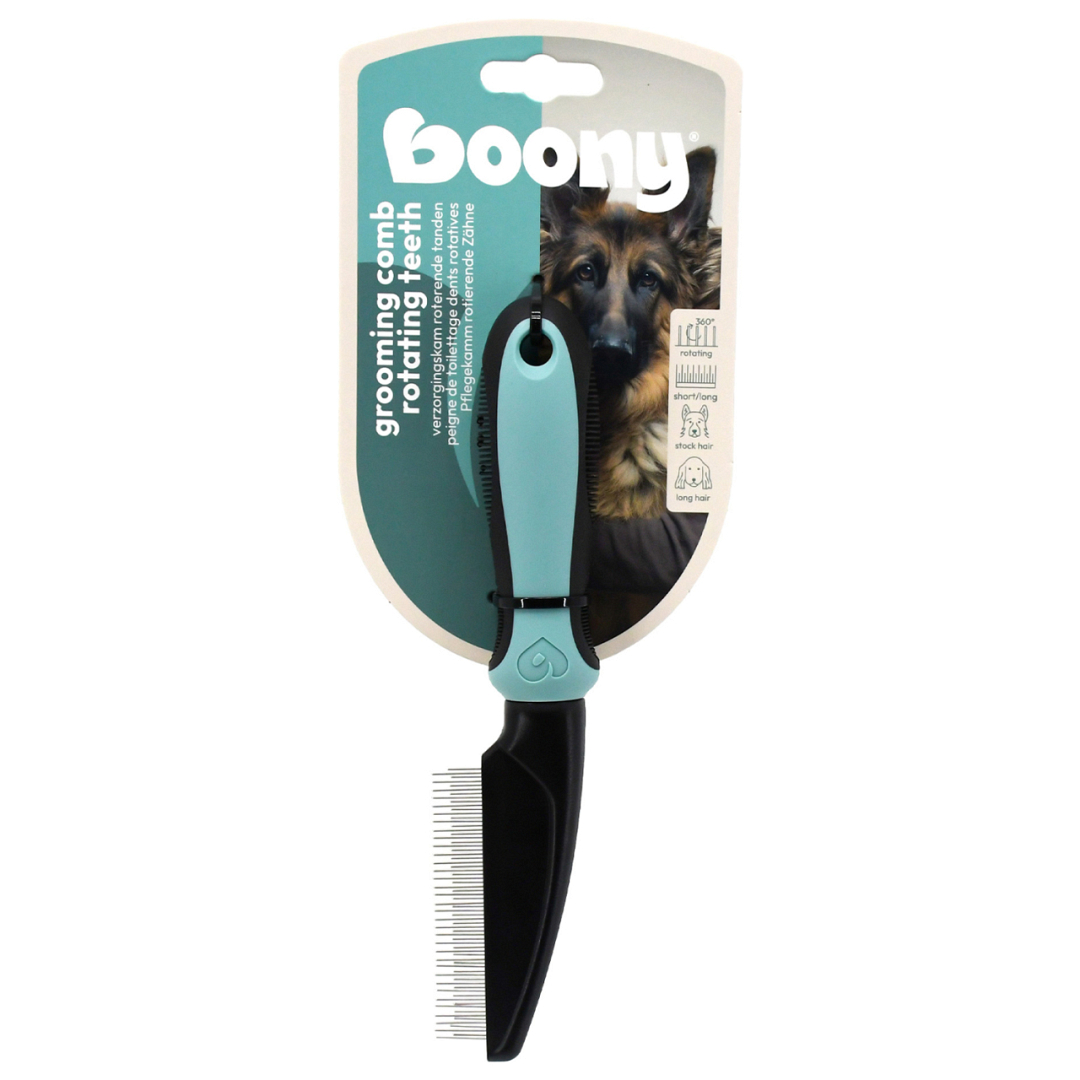Deze Boony Verzorgingskam is uitgerust met een slimme combinatie van lange en korte roterende tanden. Hierdoor bereik je zowel de boven- als de ondervacht van je hond, terwijl losse haren, vuil en klitten moeiteloos worden verwijderd. De roterende tanden glijden soepel door de vacht en maken het kammen comfortabeler dan ooit.