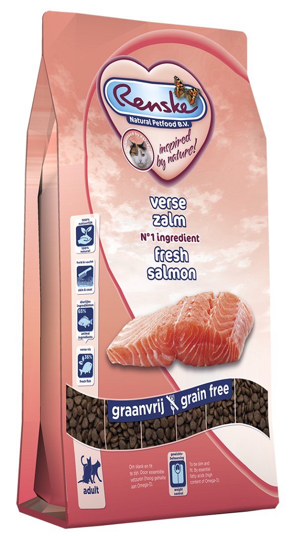 Renske Super Premium kattenvoeding zalm is een complete, licht verteerbare graanvrije voeding met verse zalm.