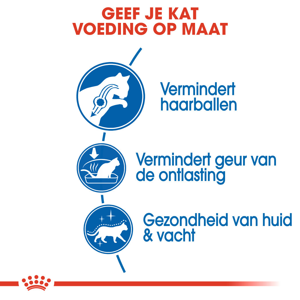 Royal Canin Indoor Long Hair helpt de ingeslikte haren op een natuurlijke wijze via de ontlasting af te voeren. De vorming van haarballen wordt op die manier beperkt. Per jaar krijgen katten zo’n 1,5 tot 3 liter haar binnen. Royal Canin Indoor Long Hair bevat voedingsstoffen die een gezonde huid en vacht helpen ondersteunen. Ook ondersteunt het de urinewegen, en doordat het een goede spijsvertering bevordert, vermindert het de geur van de ontlasting. Wel zo prettig, als je kat alle behoeftes op de kattenbak doet.