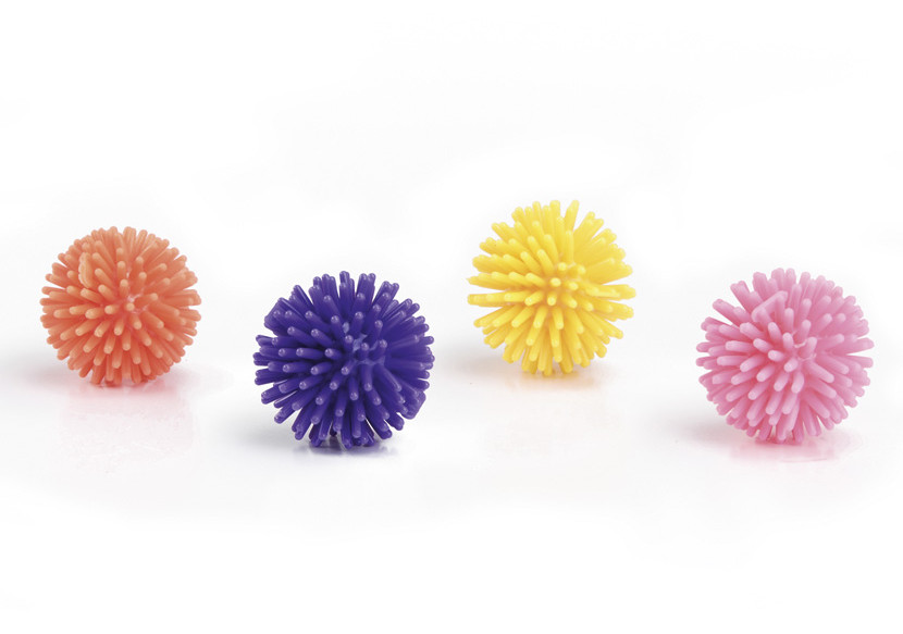 Vier grappige balletjes in verschillende vrolijke kleurtjes.