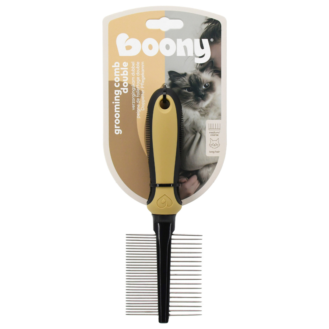 Deze dubbele verzorgingskam van Boony is een veelzijdig hulpmiddel voor de dagelijkse verzorging van langharige katten. De kam maakt de vacht los en verwijdert moeiteloos losse haren, vuil en beginnende klitten. Dankzij het slimme ontwerp biedt deze kam alles wat je nodig hebt om een lange kattenvacht gezond en goed onderhouden te houden.