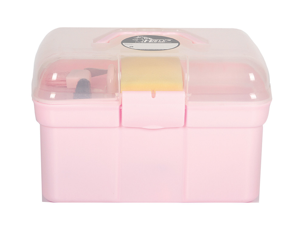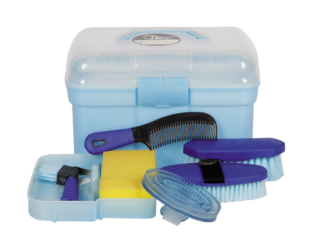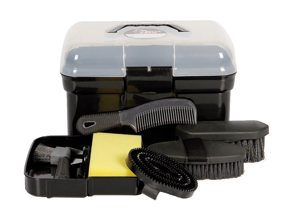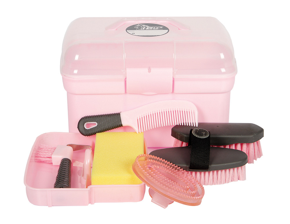 Inhoud: hoevenkrabber met borstel, glans borstel, harde borstel, rosborstel met glitters, spons en manenkam