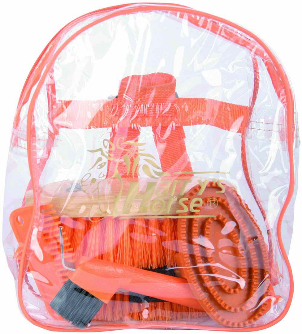 De rugtas bevat een rosborstel, harde borstel, glansborstel, manenkam en een hoevenkrabber.