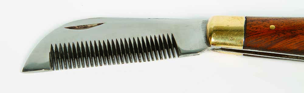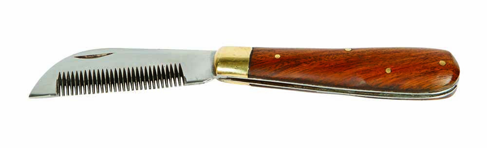 Praktisch mes voor het pijnloos uitdunnen van de manen. Mes is inklapbaar en heeft een houten handvat.