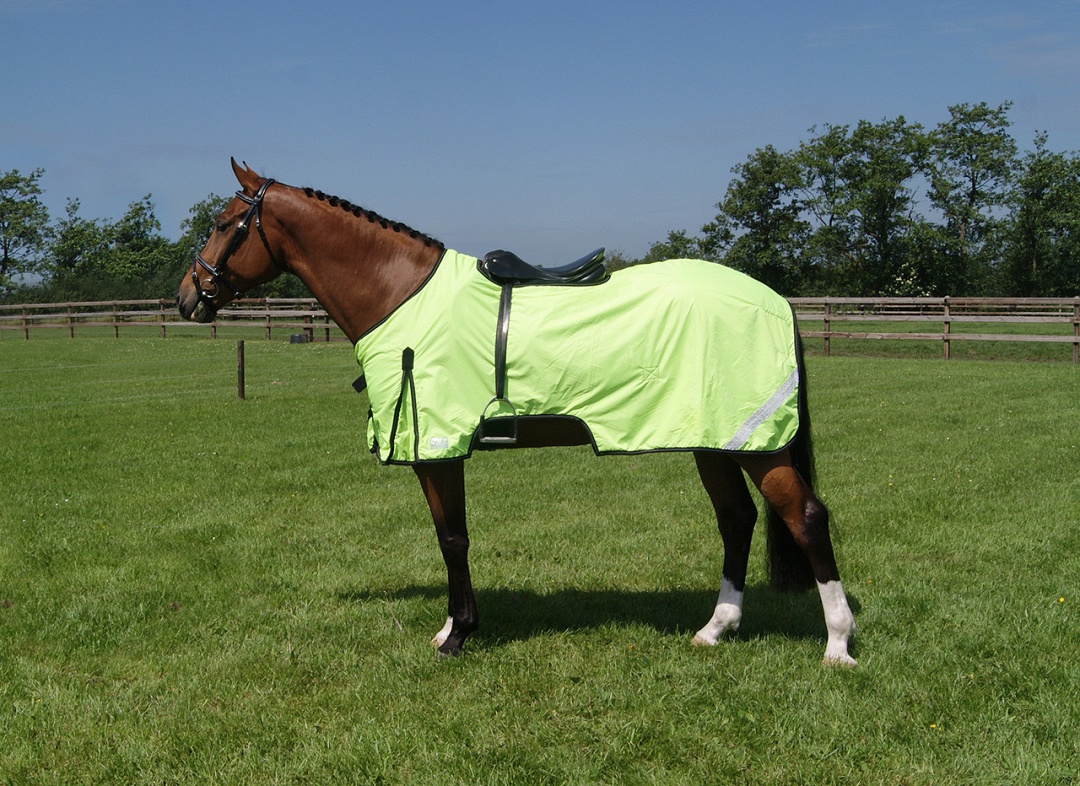 Goed zichtbare uitrijdeken met gehele bedekking van het paard. Met reflecterende lijn in de bies en uitsparing voor zadel en stijgbeugels.