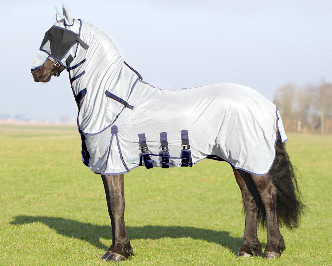 In de zomermaanden kunnen paarden veel last hebben van vliegen, dazen, muggen en andere vervelende insecten. Deze QHP vliegendeken met nek en hoed is voorzien van losse hals en hoed en speciaal ontworpen voor Friese en barokke paarden. De deken heeft een buikflap die erg mooi aansluit en dubbel vast kan worden gemaakt met klittenband en singels, hierdoor wordt verschuiving voorkomen.