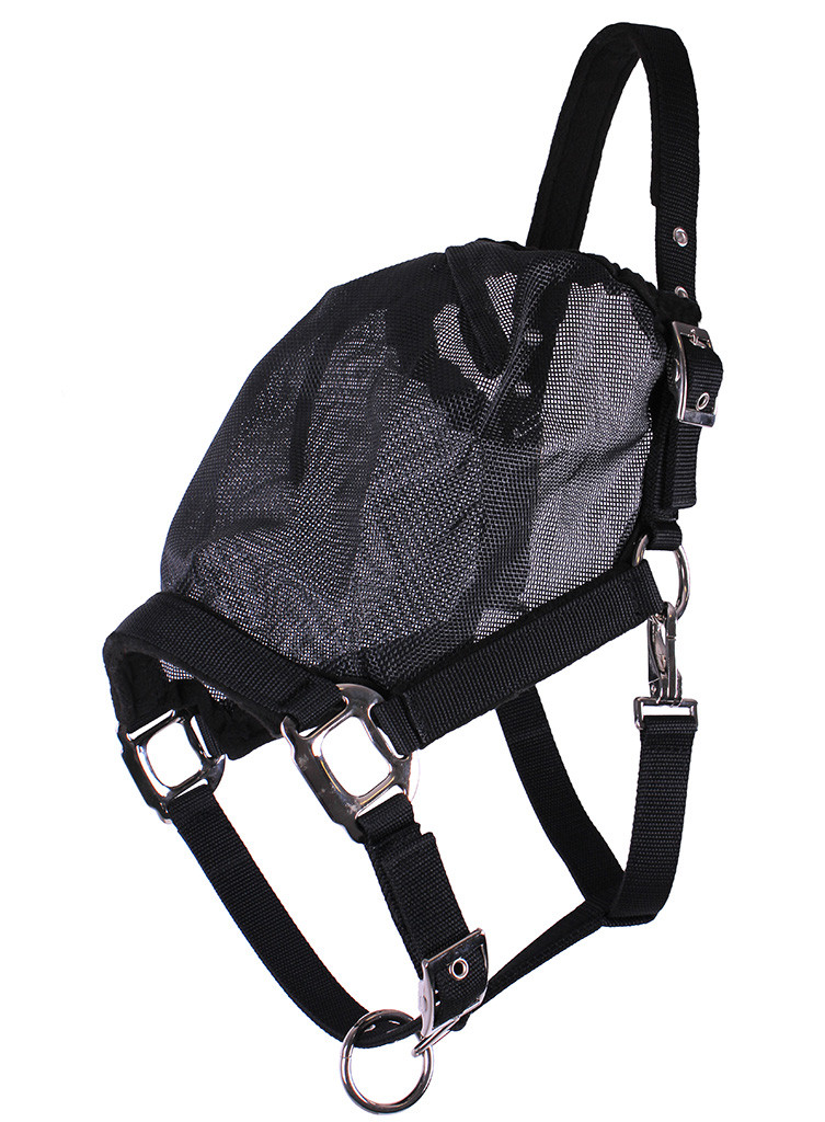 Combinatie van halster met vliegenkap, deels gemaakt van elastisch materiaal om goed aan te sluiten. Heeft met fleece gevoerde bakstukken, neusriem en frontdeel.