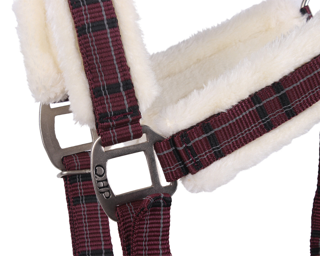 Je paard zal de QHP halsterset bont wel waarderen. Het is bij het kopstuk, de neusriem en bakstukken onderlegd met imitatiewol. Voorzien van een leuk ruitpatroon, gesatineerde fournituren. Wordt geleverd met een bijpassend halstertouw.