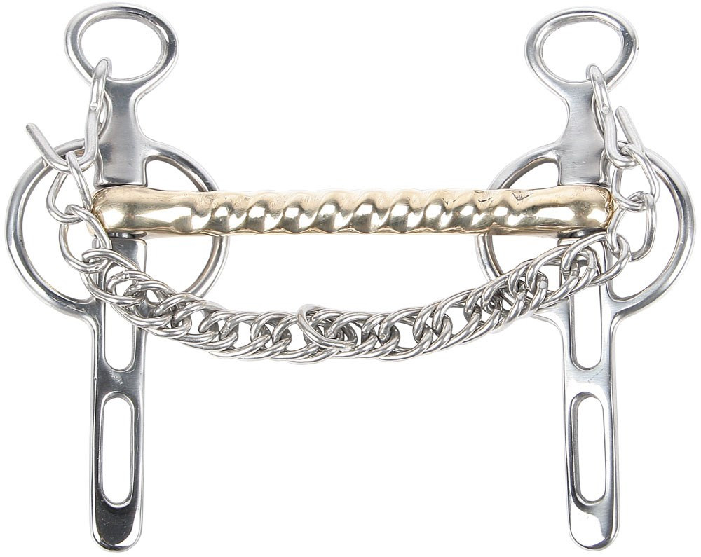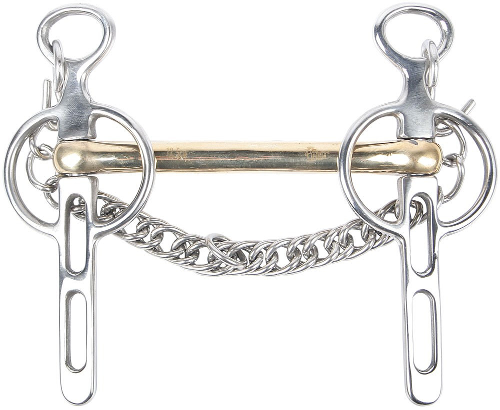 Met recht mondstuk en losse scharen met 2 sleutelgaten. Gold Brass wordt beter aangenomen door het paard en bevordert ontspanning in de mond. Incl. kinketting.