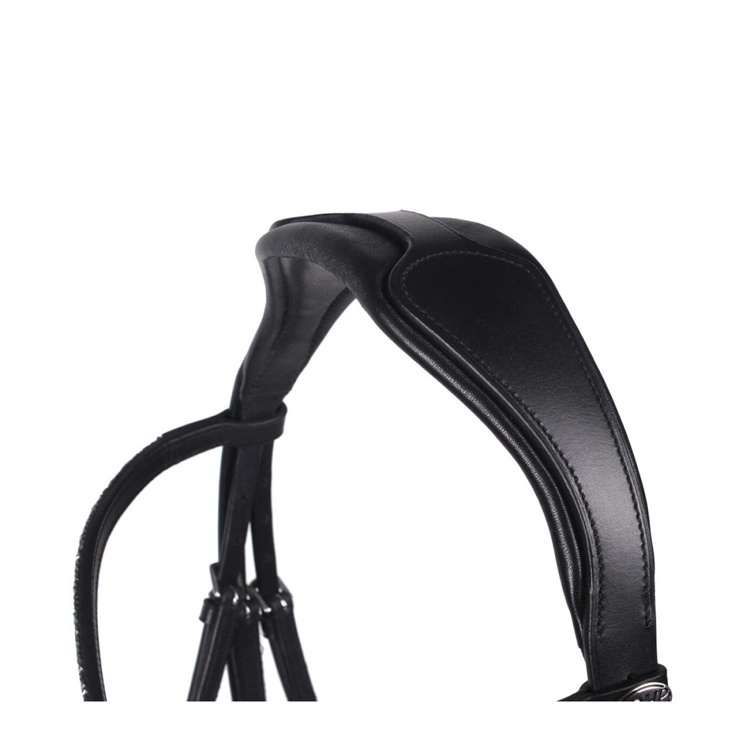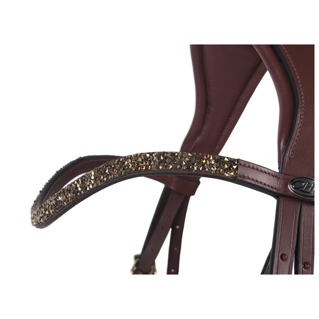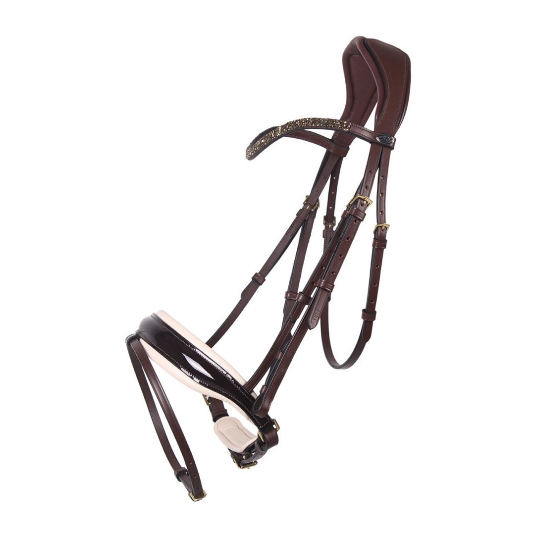 Elegant hoofdstel met lakleren neusriem en frontriem bedekt met diamantvormige strass steentjes. Het natomisch gevormde kopstuk en de neusriem met zachte padding zorgen voor een hoog draagcomfort.