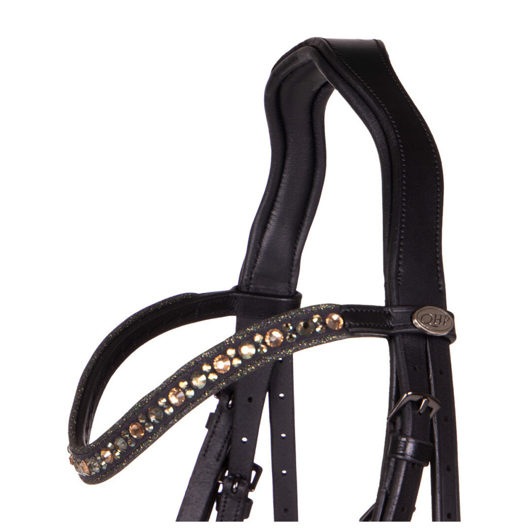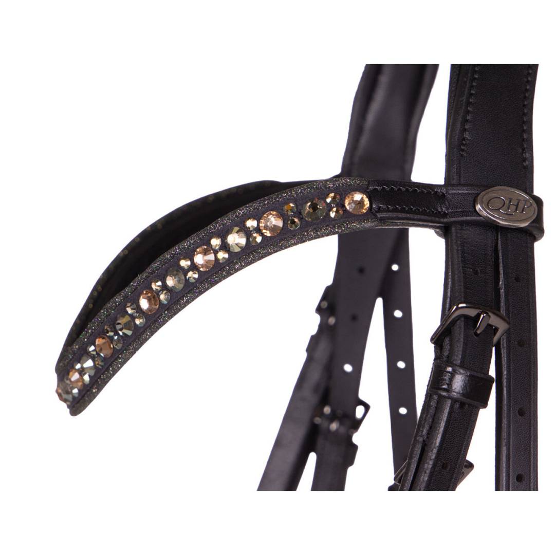 Dit QHP Hoofdstel Orlando met een laklederen neusriem is de perfecte combinatie van elegantie en comfort. De frontriem is bedekt met strass steentjes die prachtig schitteren. Dankzij het anatomisch gevormde kopstuk en de neusriem met zachte padding heeft het hoofdstel een hoog draagcomfort. De glitterrand om de laklederen neusriem maakt de elegante look helemaal af.