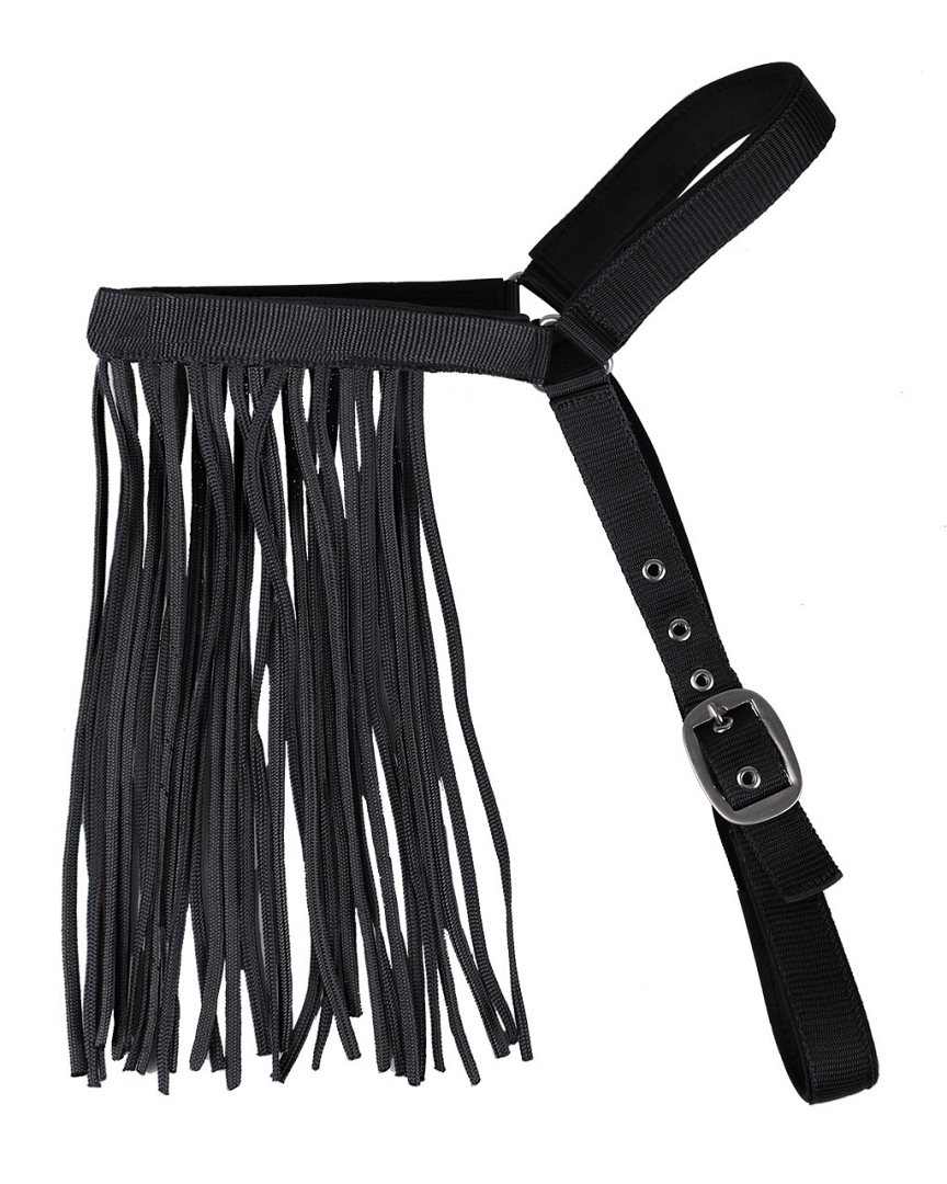 Met een vliegenfrontriem kan je paard de vliegen van zijn hoofd af houden. Dit model is voorzien van een kopstuk en een verstelbare keelriem waardoor het zonder halster te gebruiken is.