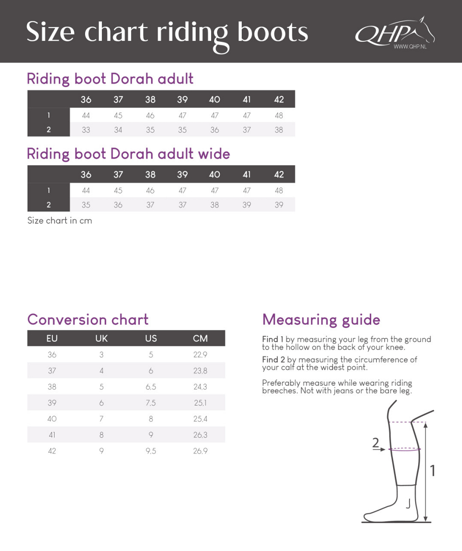 QHP Rijlaars Dorah Adult Wijd is een elegante laars met de rits aan de voorzijde. Aan de voorzijde kun je de rits sluiten met een gespriem gemaakt van lakleer.