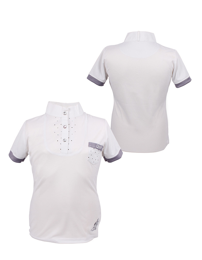 Dit QHP Junior Pearl wedstrijdshirt met glitterdetails doet iedereen stralen. Met een zakje dat ook is voorzien van strass steentjes in zilver en grijs.