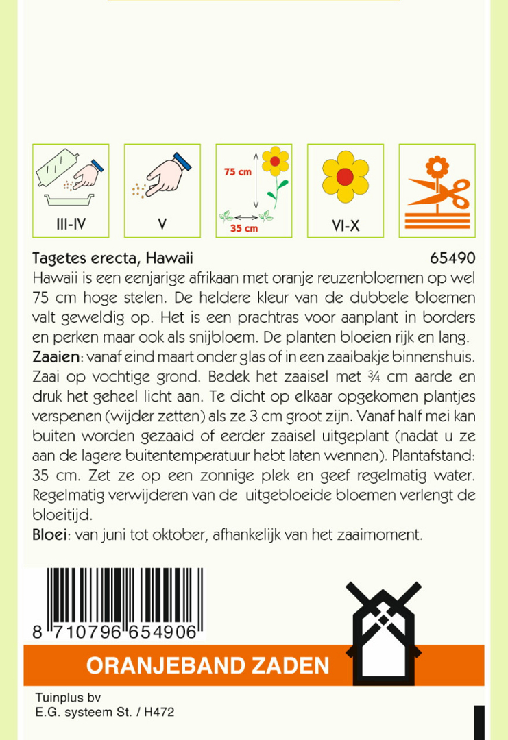 Hawaii is een eenjarige afrikaan met oranje reuzenbloemen op wel 75 cm hoge stelen. De heldere kleur van de dubbele bloemen valt geweldig op. Het is een prachtras voor aanplant in borders en perken maar ook als snijbloem. De planten bloeien rijk en lang.