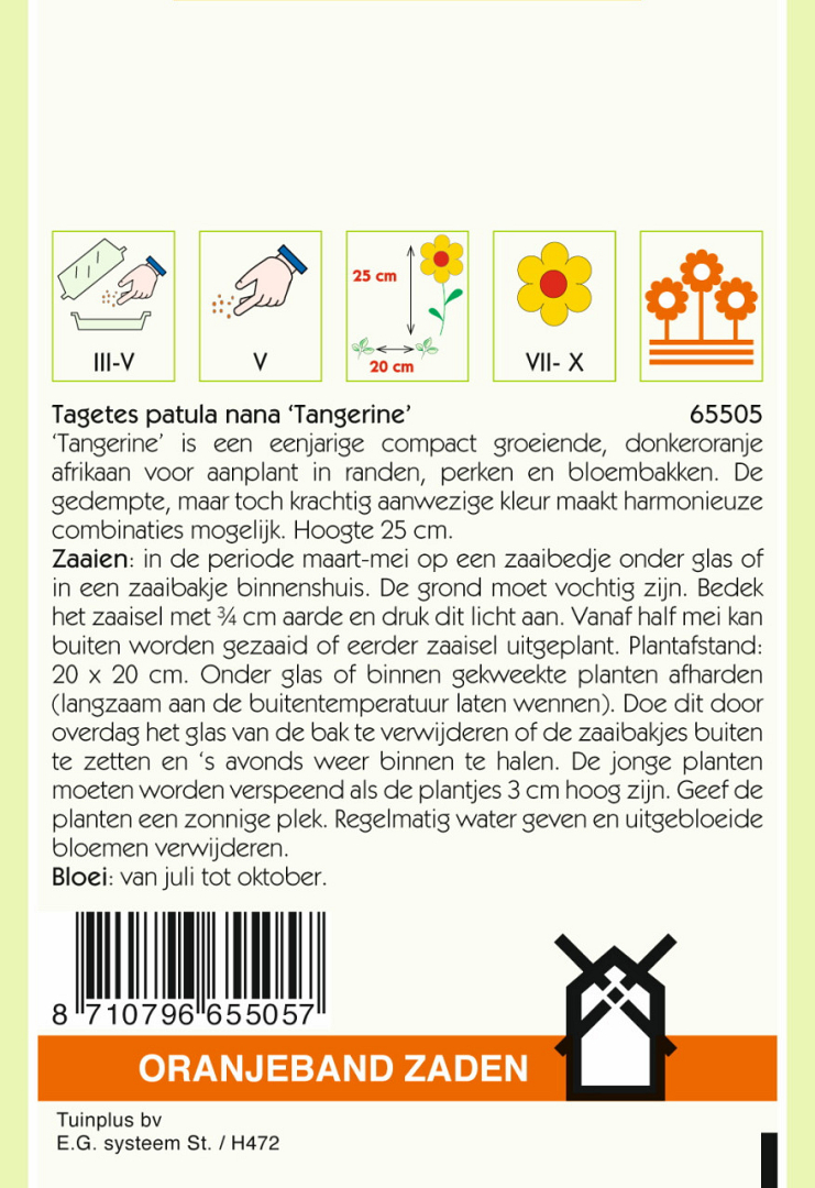 Tangerine’ is een eenjarige compact groeiende, donkeroranje afrikaan voor aanplant in randen, perken en bloembakken. De gedempte, maar toch krachtig aanwezige kleur maakt harmonieuze combinaties mogelijk. Hoogte 25 cm.
