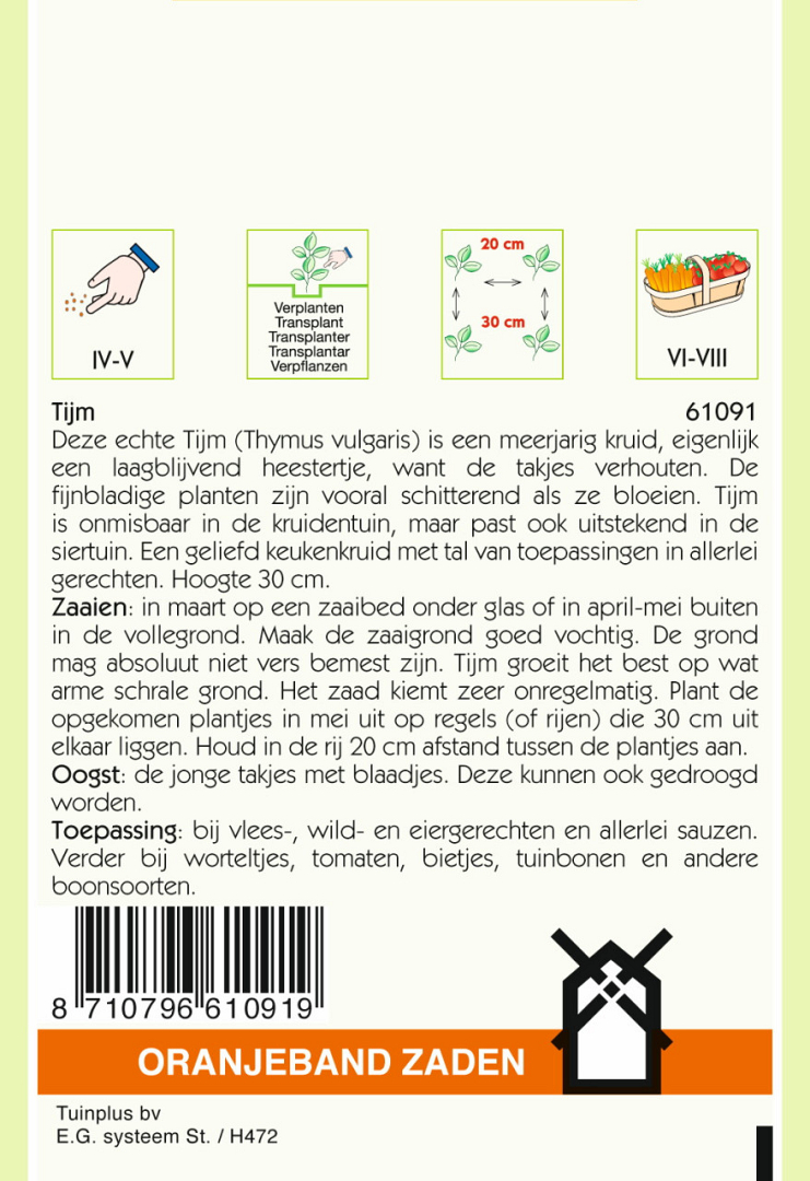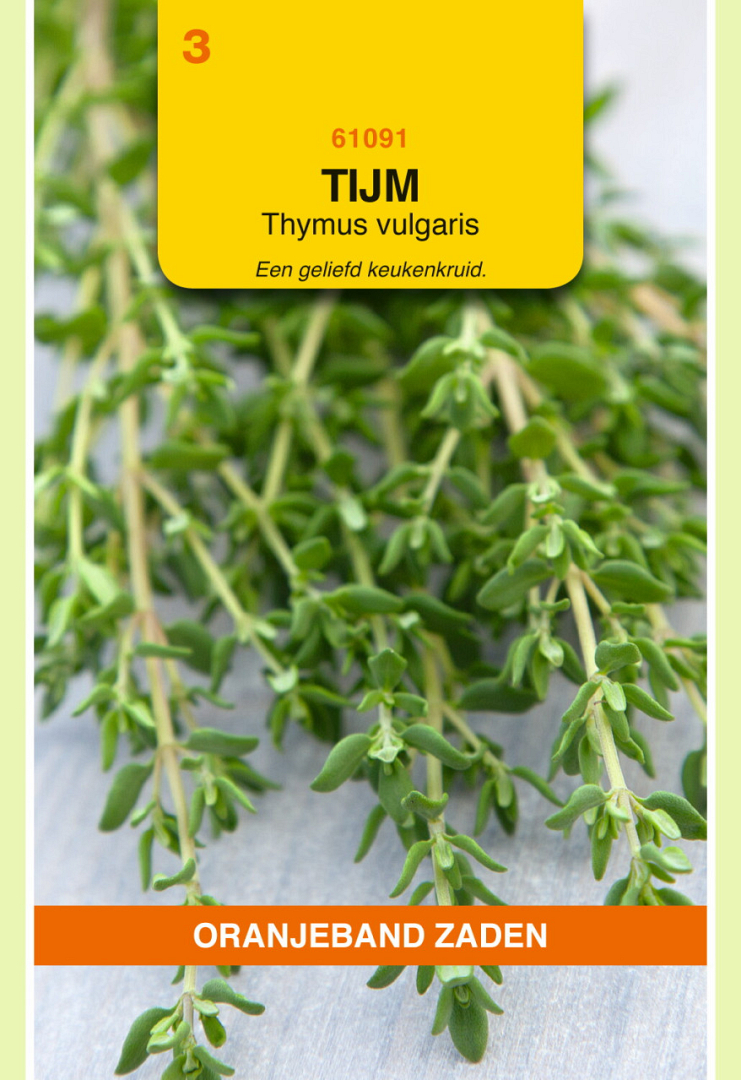 Zaaien: in maart op een zaaibed onder glas of in april-mei buiten in de vollegrond. Maak de zaaigrond goed vochtig. De grond mag absoluut niet vers bemest zijn. Tijm groeit het best op wat arme schrale grond. Het zaad kiemt zeer onregelmatig. Plant de opgekomen plantjes in mei uit op regels (of rijen) die 30 cm uit elkaar liggen. Houd in de rij 20 cm afstand tussen de plantjes aan.
