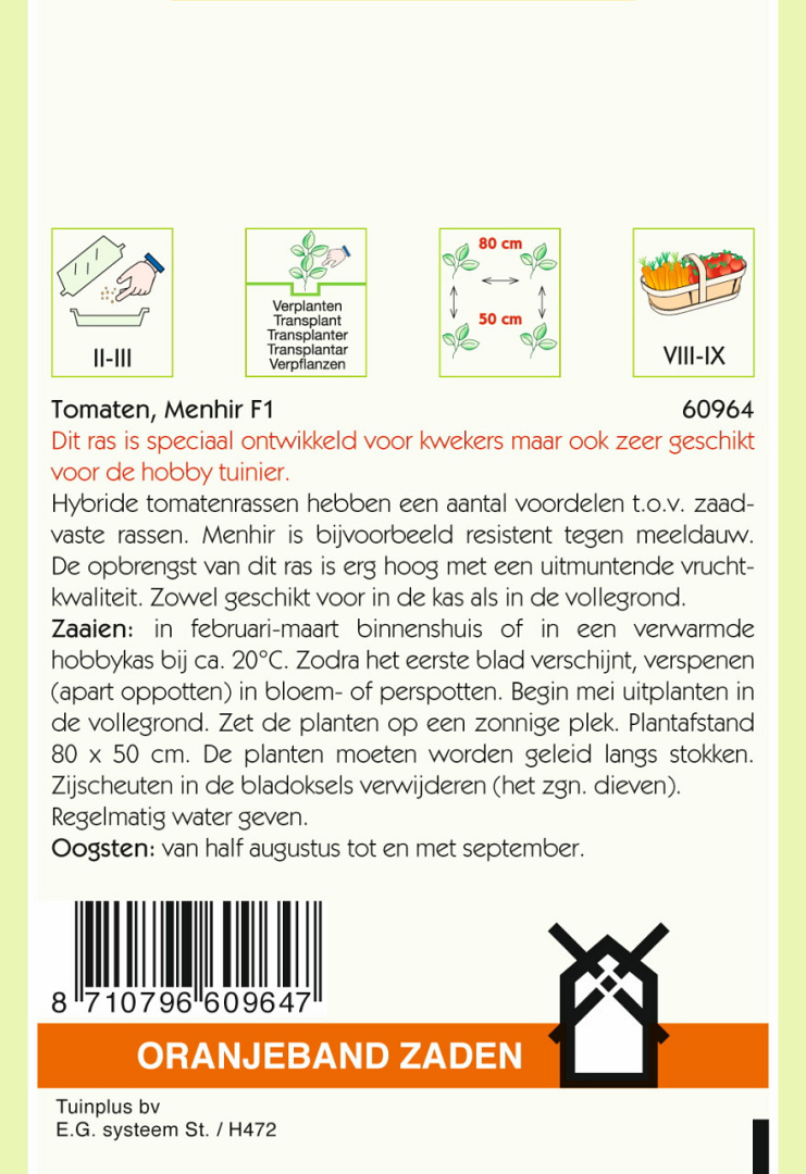 Dit ras is speciaal ontwikkeld voor kwekers maar ook zeer geschikt voor de hobby tuinier. Hybride tomatenrassen hebben een aantal voordelen t.o.v. zaadvaste rassen. Menhir is bijvoorbeeld resistent tegen meeldauw. De opbrengst van dit ras is erg hoog met een uitmuntende vruchtkwaliteit. Zowel geschikt voor in de kas als in de vollegrond.