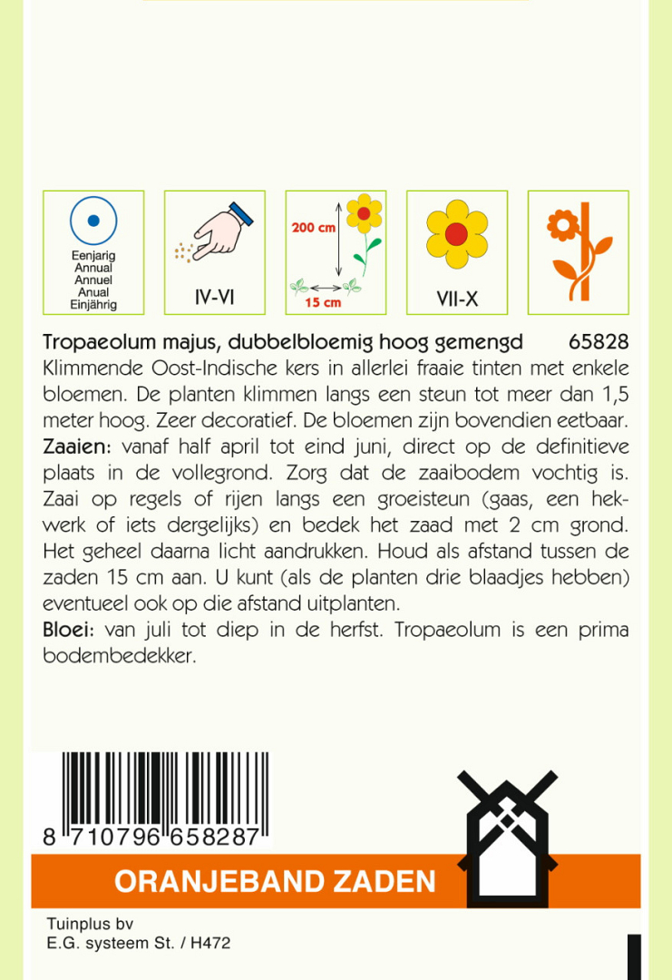 Klimmende Oost-Indische kers in allerlei fraaie tinten met dubbele bloemen. De planten klimmen langs een steun tot meer dan 1,5 m hoog. Zeer decoratief. De bloemen zijn bovendien eetbaar.