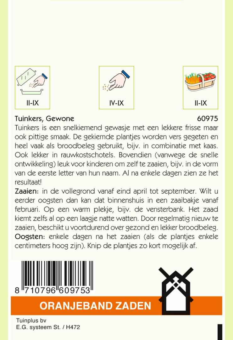 Zaaien: in de vollegrond vanaf eind april tot september. Wilt u eerder oogsten dan kan dat binnenshuis in een zaaibakje vanaf februari. Op een warm plekje, bijv. de vensterbank. Het zaad kiemt zelfs al op een laagje natte watten. Door regelmatig nieuw te zaaien, beschikt u voortdurend over gezond en lekker broodbeleg.