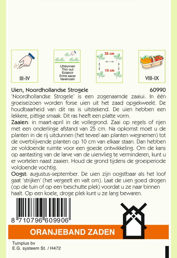 Oogst: augustus-september. De uien zijn oogstbaar als het loof gaat ‘strijken’ (het vergeelt en valt om). Laat de uien goed drogen (op de tuin of op een beschutte plek) voordat u ze naar binnen haalt. Op een koele, droge plek kunt u ze lang bewaren.