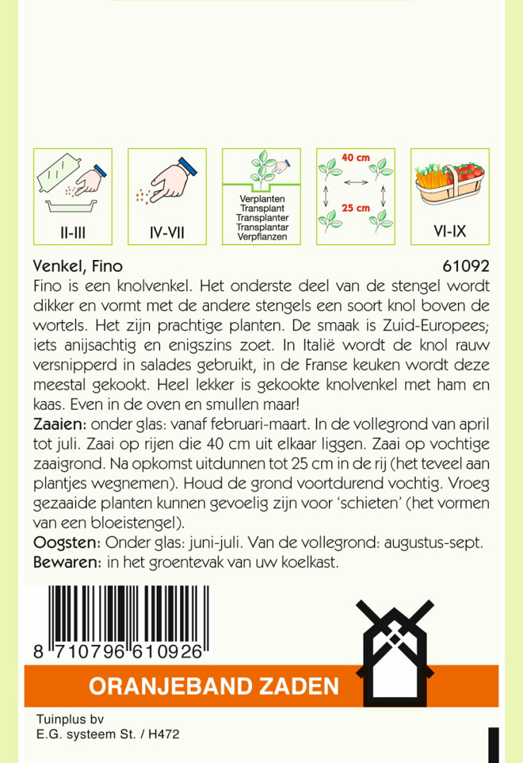 Fino is een knolvenkel. Het onderste deel van de stengel wordt dikker en vormt met de andere stengels een soort knol boven de wortels. Het zijn prachtige planten. De smaak is Zuid-Europees; iets anijsachtig en enigszins zoet. In Italië wordt de knol rauw versnipperd in salades gebruikt, in de Franse keuken wordt deze meestal gekookt. Heel lekker is gekookte knolvenkel met ham en kaas. Even in de oven en smullen maar!