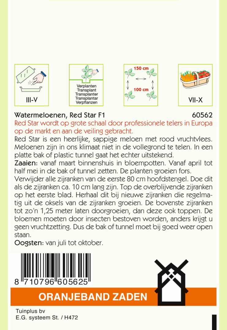 Watermeloen Red Star F1 Hybride zaden. 'Red Star' is een exclusief kweekproduct van Nunza BV te Haelen en wordt op grote schaal door professionele telers in Europa op de markt en aan de veiling gebracht, een garantie voor extra kwaliteit. Red Star F1 hybride is en heerlijke, sappige meloen met rood vruchtvlees. Meloenen zijn in ons klimaat niet in de vollegrond te telen. In een platte bak of plastic tunnel gaat het echter uitstekend.