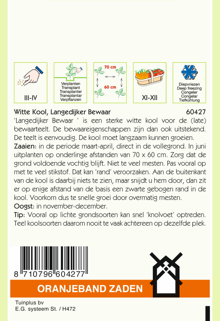 ‘Langedijker Bewaar ‘ is een sterke witte kool voor de (late) bewaarteelt. De bewaareigenschappen zijn dan ook uitstekend. De teelt is eenvoudig. De kool moet langzaam kunnen groeien.