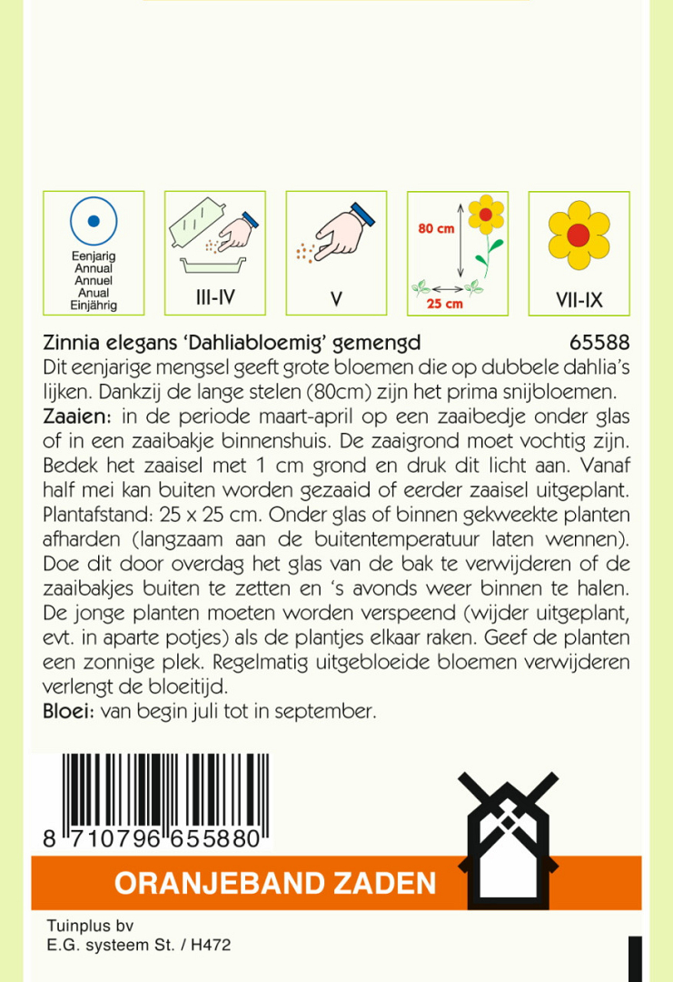 Dit eenjarige mengsel geeft grote bloemen die op dubbele dahlia’s lijken. Dankzij de lange stelen (80cm) zijn het prima snijbloemen. Zaaien: in de periode maart-april op een zaaibedje onder glas of in een zaaibakje binnenshuis. De zaaigrond moet vochtig zijn. Bedek het zaaisel met 1 cm grond en druk dit licht aan. Vanaf half mei kan buiten worden gezaaid of eerder zaaisel uitgeplant. Plantafstand: 25 x 25 cm. Onder glas of binnen gekweekte planten afharden (langzaam aan de buitentemperatuur laten wennen). Doe dit door overdag het glas van de bak te verwijderen of de zaaibakjes buiten te zetten en ‘s avonds weer binnen te halen. De jonge planten moeten worden verspeend (wijder uitgeplant, evt. in aparte potjes) als de plantjes elkaar raken. Geef de planten een zonnige plek. Regelmatig uitgebloeide bloemen verwijderen verlengt de bloeitijd.