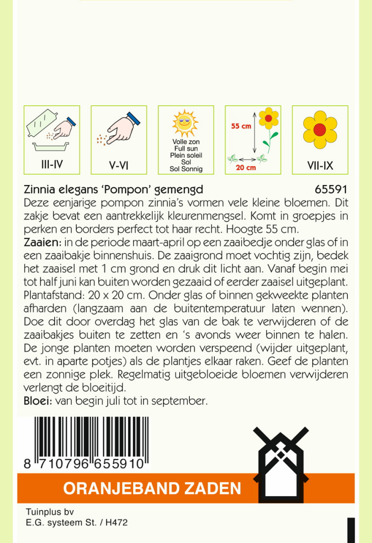 Deze eenjarige pompon-zinnia’s vormen vele kleine bloemen. Dit zakje bevat een aantrekkelijk kleurenmengsel. Komt in groepjes in perken en borders perfect tot haar recht. Hoogte 55 cm.