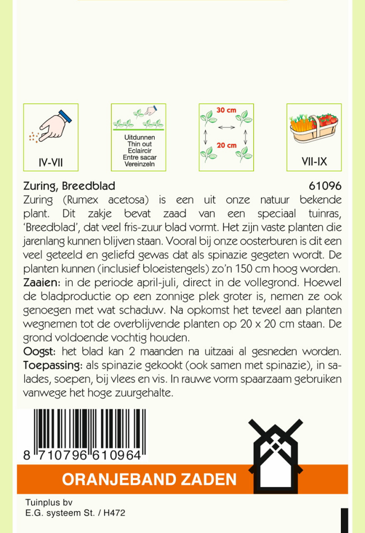 Zuring (Rumex acetosa) is een uit onze natuur bekende plant. Dit zakje bevat zaad van een speciaal tuinras, ‘Breedblad’,dat veel fris-zuur blad vormt. Het zijn vaste planten die jarenlang kunnen blijven staan. Vooral bij onze oosterburen is dit een veel geteeld en geliefd gewas dat als spinazie gegeten wordt. De planten kunnen (inclusief bloeistengels) zo’n 150 cm hoog worden.