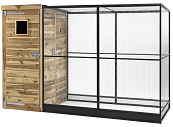 Volière met ruim nachthok van geïmpregneerd hout en vlucht van aluminium. Met draaibaar voedersysteem welke van buitenaf gevuld kan worden. Afm. 289 x 120 x 190 cm.